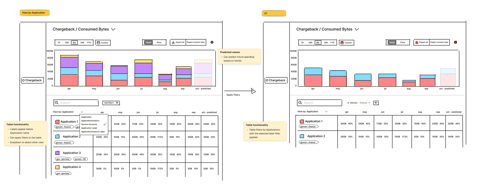 After a lot of exploration, we decided on a split-screen approach. This allows the user to both see what is happening at a glance, and give them the ability to dive deeper if desired. The top half of the screen should show a stacked bar graph, allowing them to view costs by when it happened, and which team is responsible. This also enabled non-technical users to track costs as its main goal was visual clarity.