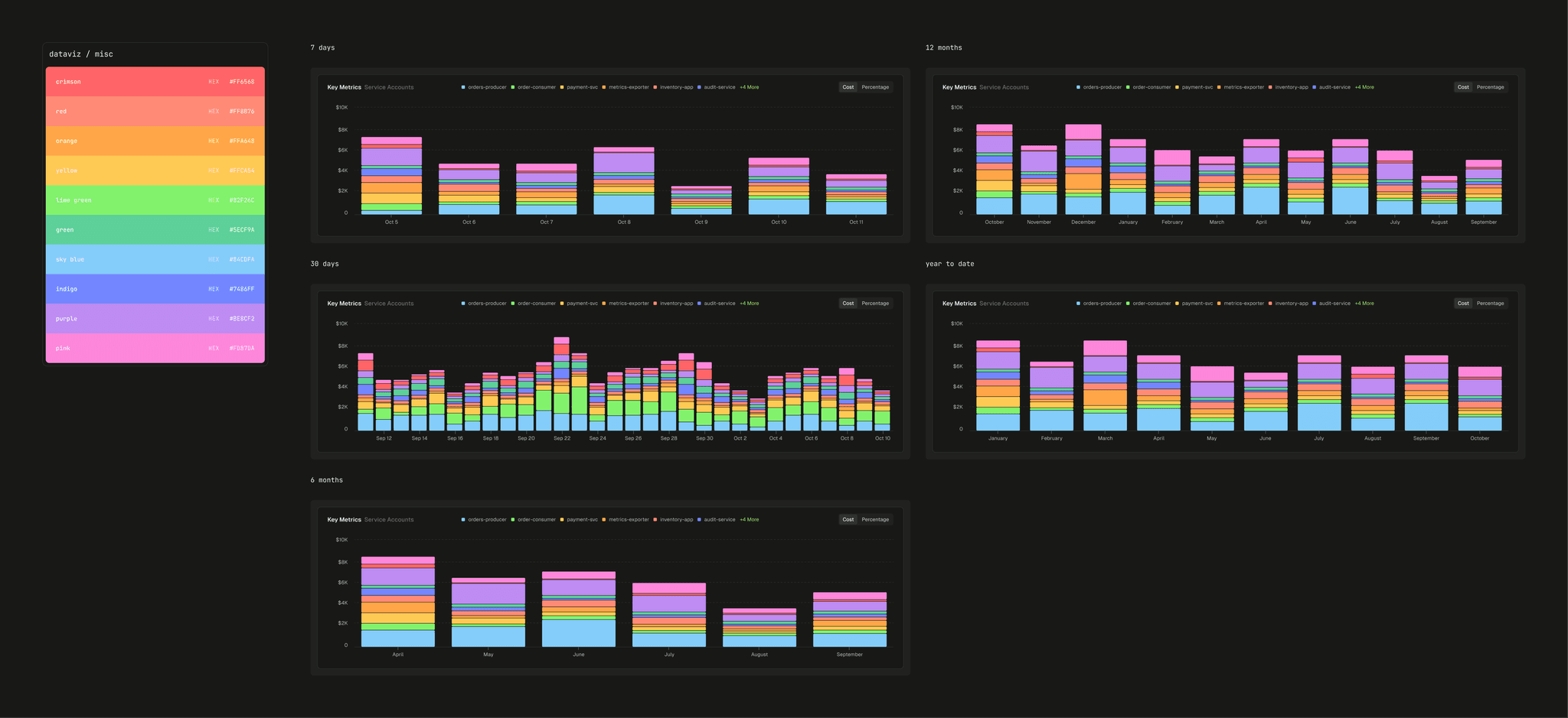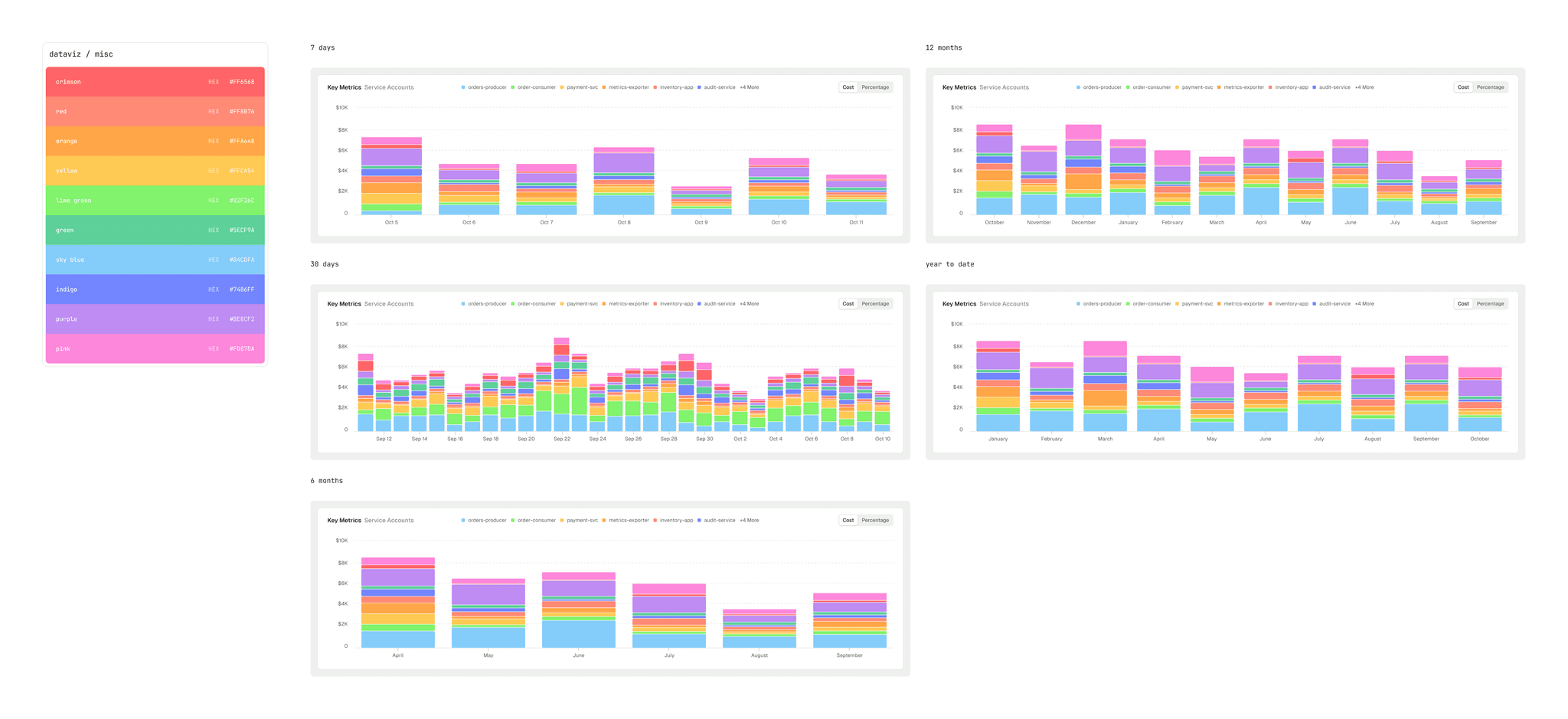 I developed a colour system with light and dark versions of each, plus a library of bar chart examples demonstrating usage. This is now a core part of our design system documentation, serving as a frame of reference for future bar graphs.