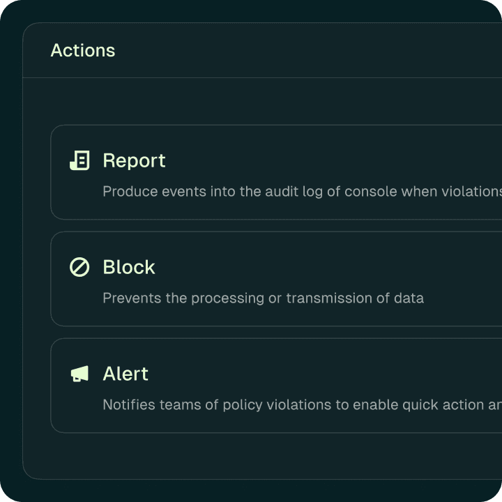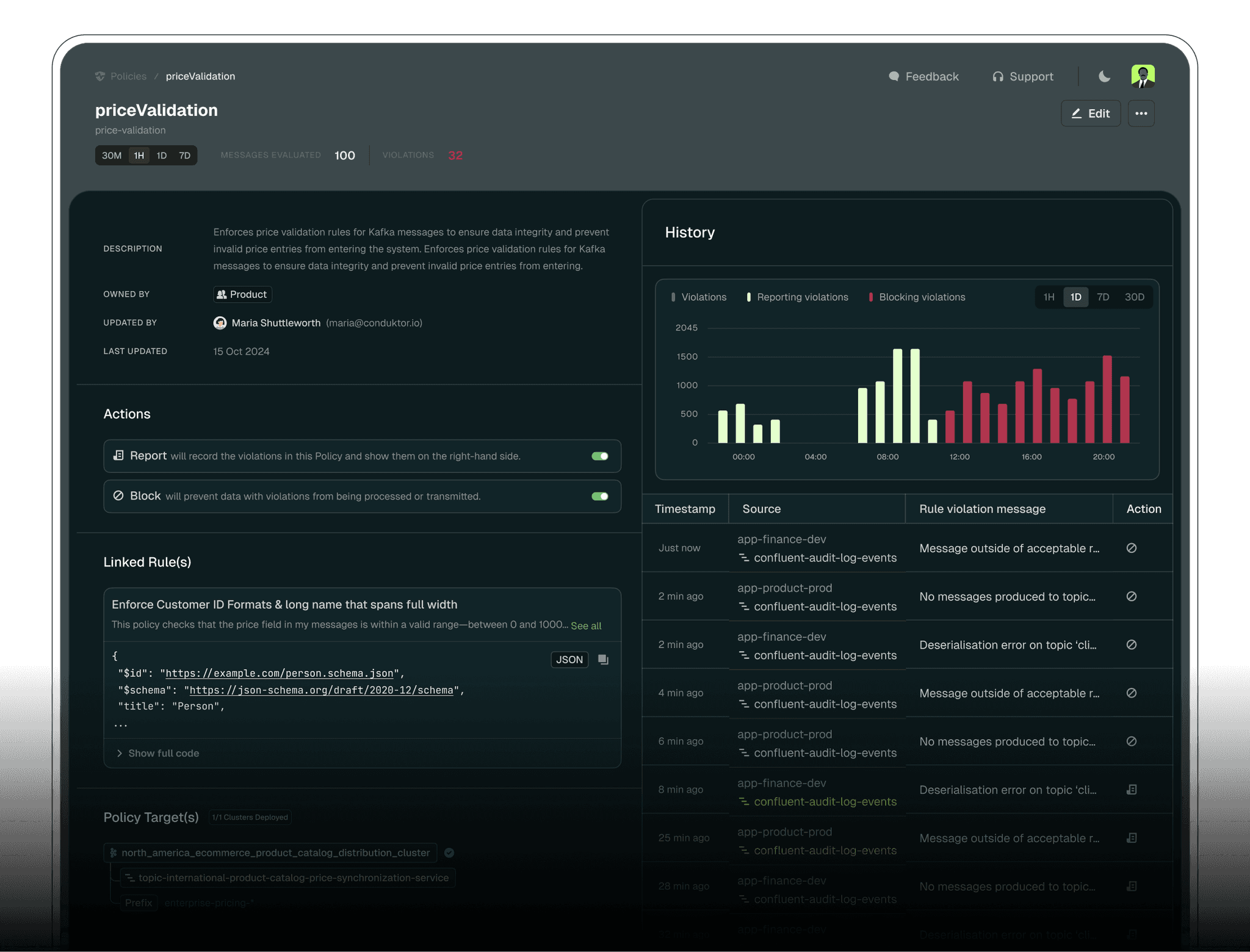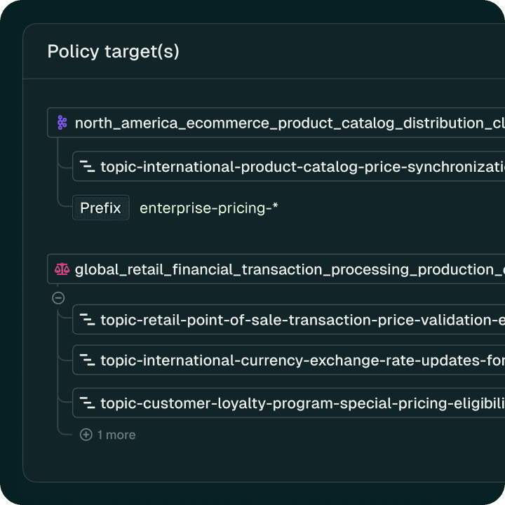 Create a Policy. A Policy consists of attached Rules, a Target, and Actions. All these combined allow you to administer rules across your entire Kafka environment, rather than devolving responsibilities to teams or individuals. This helps encourage best practices around visibility and data quality while reducing risk and increasing compliance.