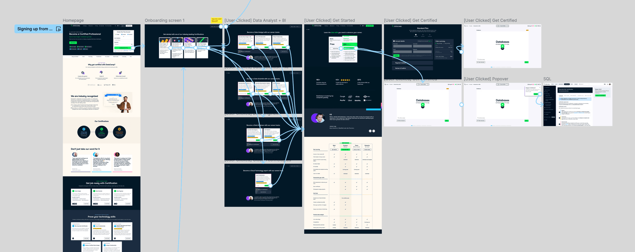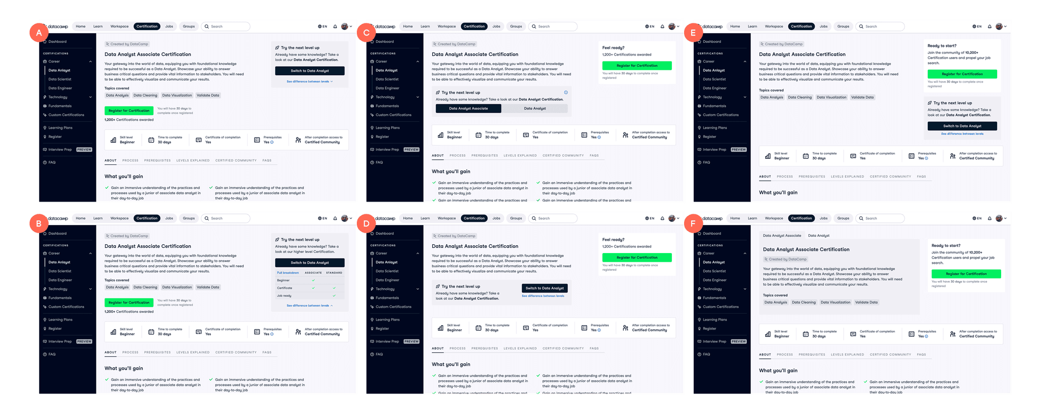 We created pages for each Certification, which was a great start. However, our onboarding process was the same, no matter which of DataCamp's products you were signing up to use. This meant that even if you were signing up from a Certification page because you were interested in getting certified, your onboarding process would instead direct you to learning materials for the general product.