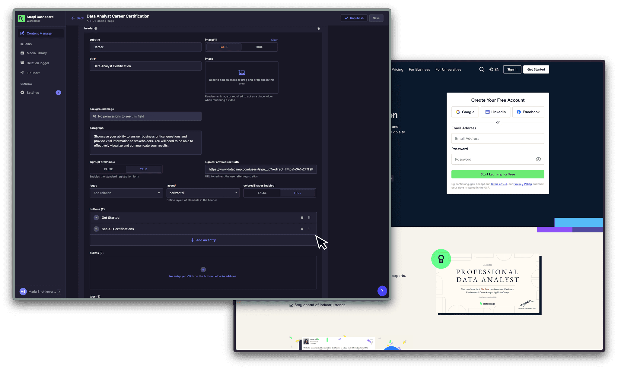 A limitation of the project was that I had to work with our CMS, Strapi, which restricted our design options. However we were able to represent DataCamp's design language in the end, after a small learning curve.
